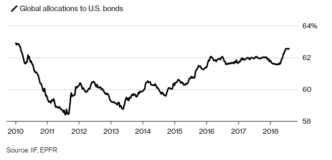 Согласно оценкам Института международных финансов, около 62,6% всех мировых потоков идут в фонды американских облигаций, что является рекордом с 2010 г. То есть, в двух случаях из трех инвесторы выбирают долговые бумаги США.