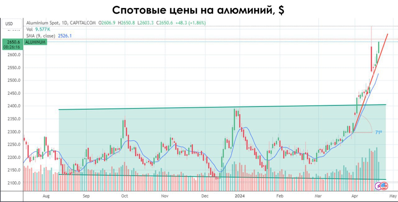 На фоне введения санкций цены на алюминий на мировом рынке резко выросли. 15 апреля на LME металл подорожал на 9,4%, показав самый большой прирост за день как минимум с 1987 года.