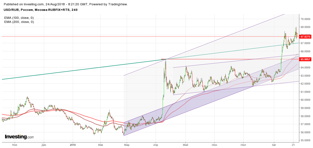 Движение наверх выдыхается, очень похоже на заключительную локальную волну наверх перед большой коррекцией. Еще возможен перехай 69 рублей на негативных новостях. Уровень поддержки подрос 67,1 руб./доллар. Тренд пока растущий, но есть признаки затухания.