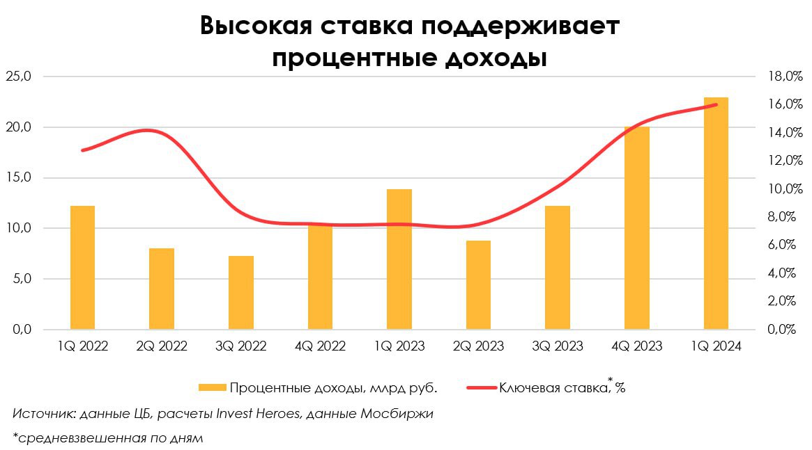 Результаты за 1 кв. указывают на то, что может обновиться рекорд по процентным доходам по году, но если КС повысится, то компания сможет заработать еще больше (при сохранении текущего уровня остатков денежных средств на счетах клиентов).