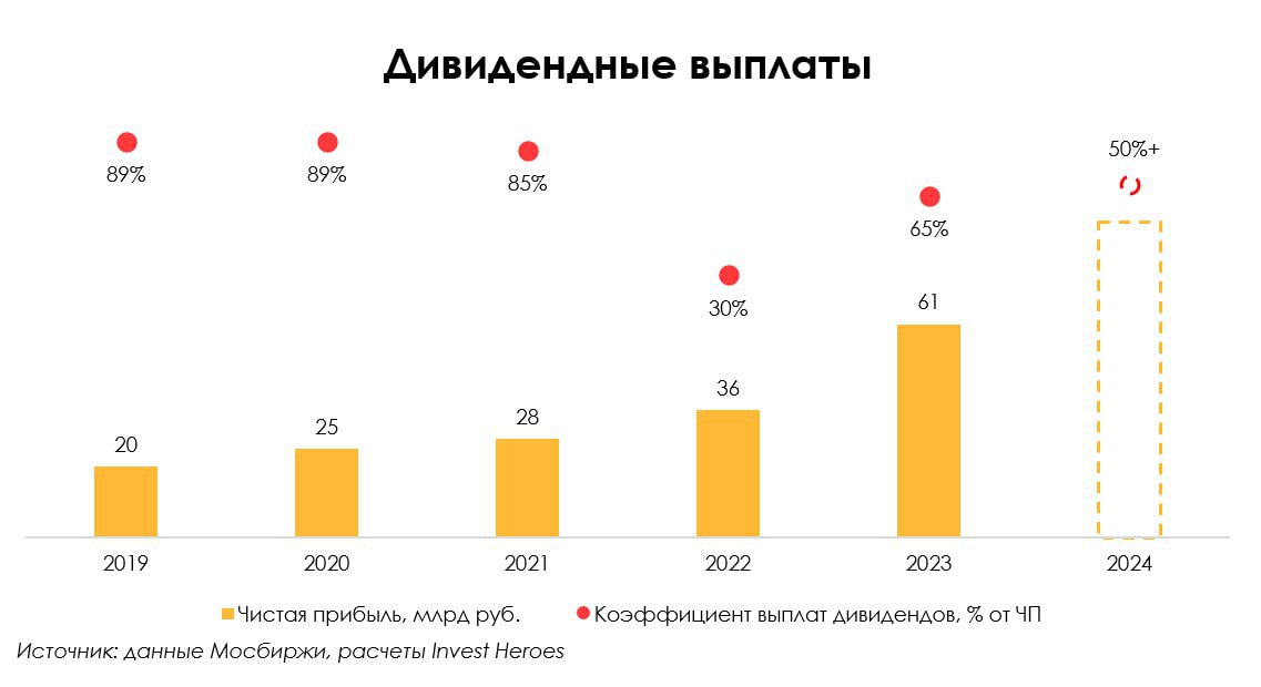 По итогам 2023 года Мосбиржа объявила дивиденды в размере 65% от чистой прибыли по МСФО. Это дает 7% дивидендной доходности к текущей цене (17,35 руб. на акцию), дата отсечки 14 июня 2024 г. С учетом всего вышесказанного предполагаем, что Мосбиржа может обновить рекорд по чистой прибыли в 2024 году и выплатить высокий дивиденд. Среднее значение выплат за период 2017-2020 гг. составило 88% от чистой прибыли. По итогам 2024 года див. доходность может быть порядка 9-14% к текущей цене (в зависимости от коэффициента выплаты), при этом мы не закладываем в прогноз в качестве базового сценария выплату по верхней границе.