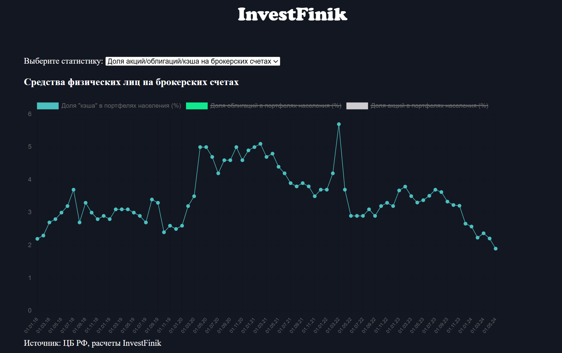 К маю доля денежных средств физлиц на брокерских счетах снизилась до 1,9%, что является абсолютным минимумом. В то же самое время доля акций выросла, а облигаций упала.