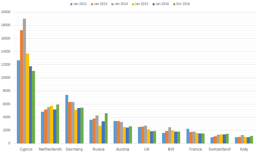 Подобно Кипру, Нидерланды являются популярным каналом для капитала со всего мира и лишь формально входят в число крупнейших мировых источников прямых иностранных инвестиций. Например, часть $1,8 млрд прямых иностранных инвестиций в телекоммуникационный сектор Украины поступает от зарегистрированного в Нидерландах «Вымпелкома», которому принадлежит «Киевстар», крупнейший украинский оператор сотовой связи. Однако крупнейшим владельцем "Вымпелкома" (через посредников) является российская "Альфа-групп"