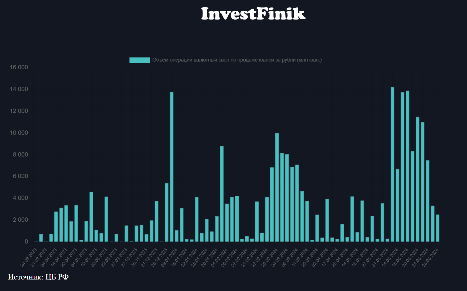 Во-первых, объемы своп-операций по продаже юаней за рубли опустились с 14,2 млрд юаней до 2,5 млрд.