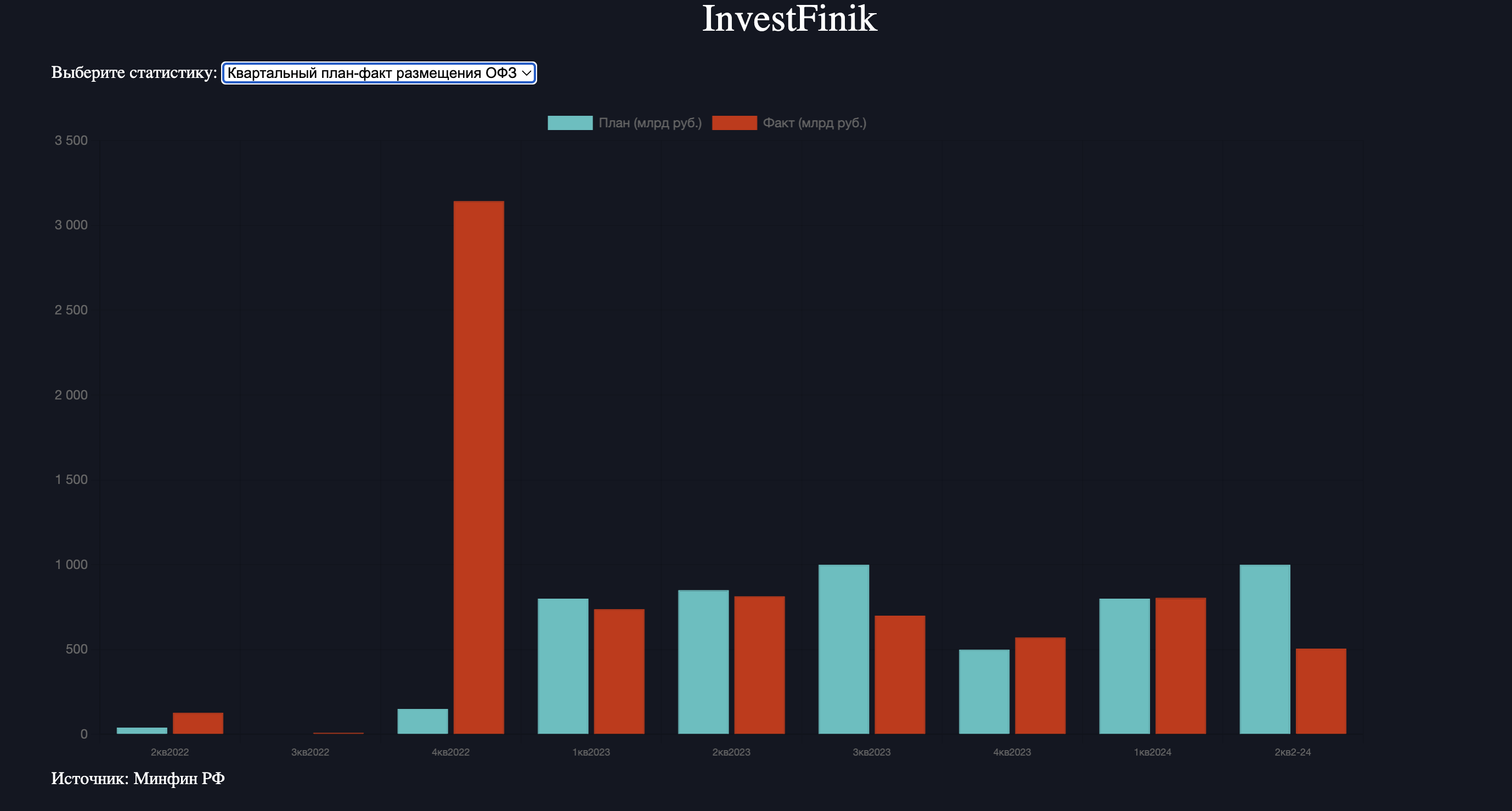 На второй квартал 2024 г. у Минфина стоял план по привлечению 1 трлн рублей через ОФЗ, факт оказался в два раза меньше.
