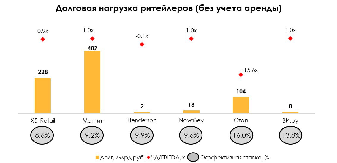 — В 2024 г. компания планирует погасить 36% долга, а в 2025 г. — 28% долга. Чтобы поддерживать долг на комфортном уровне Х5 придется его рефинансировать, но под более высокую ставку. Это в свою очередь повысит средневзвешенную ставку с 8,6% по итогам 2023 г. до 12,3%, по нашим расчетам.