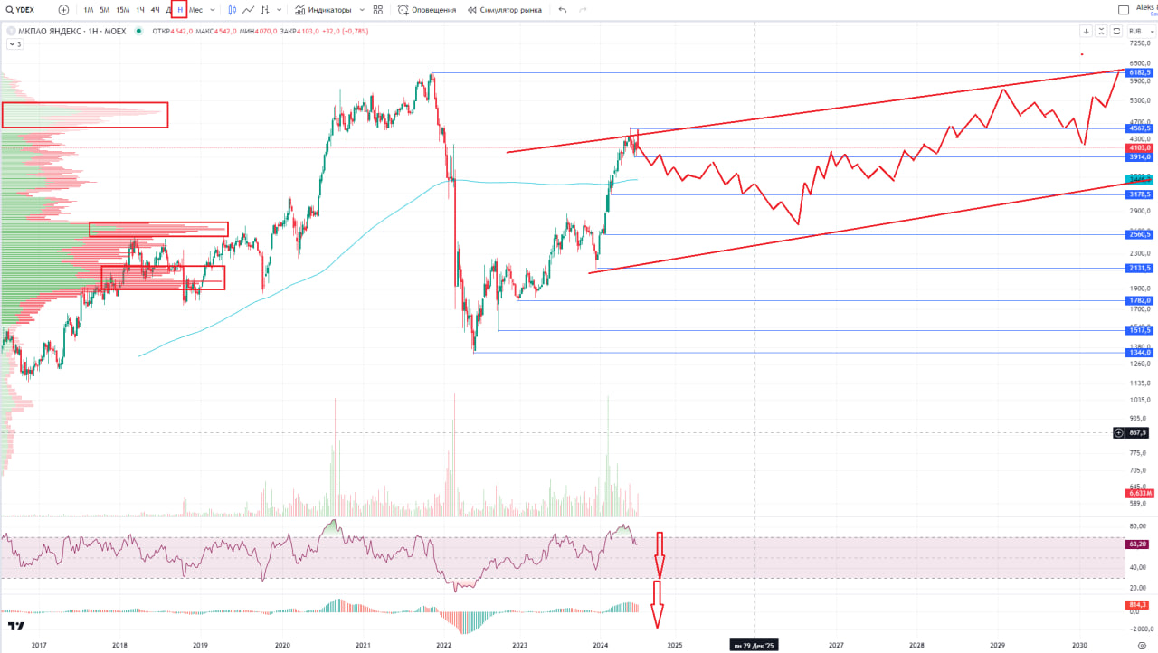 Учитывая, что на недельном ТФ за коррекцию, это более длительный период, могу предположить, что от акций Яндекса сейчас стоит ждать больше коррекции. Куда? Думаю в район 200-дневной скользящей, в район 3200, там же находится ближайший уровень поддержки Если этот уровень не устоит пойдем к 2550, там находится следующий уровень поддержки. Но после коррекции я жду продолжения трена - роста. Все отобразил на графике.