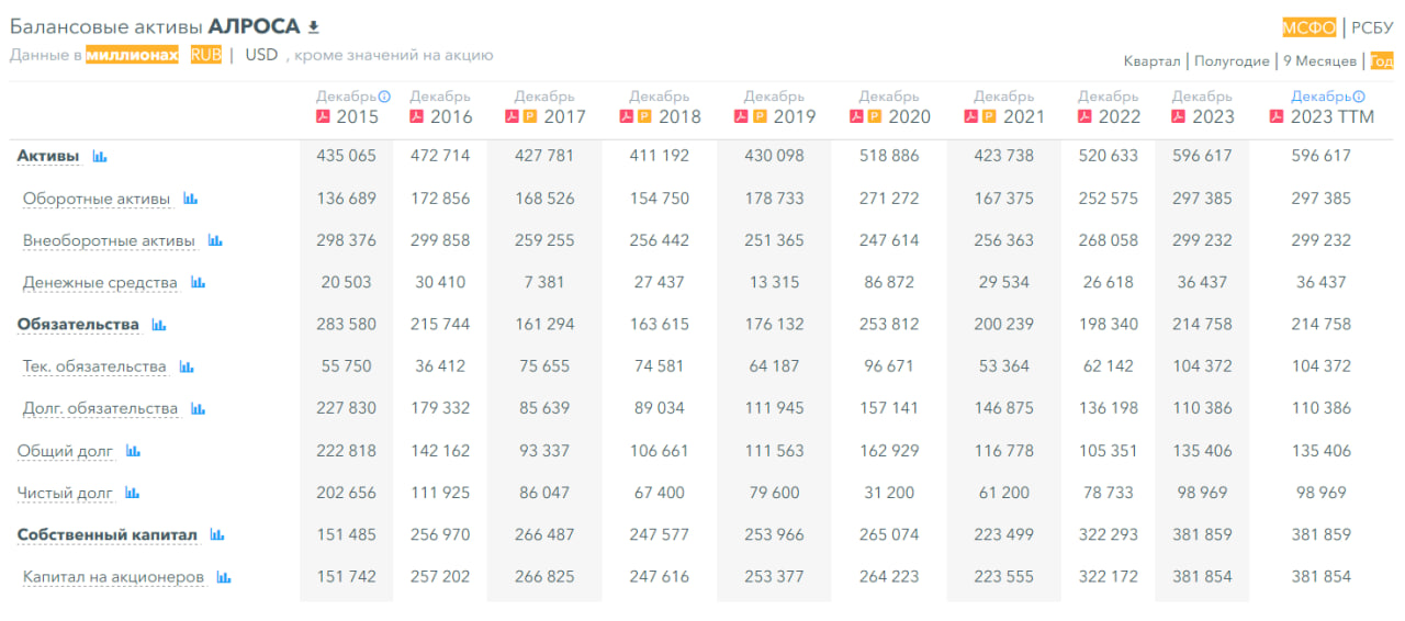 ▪️Собственный капитал. Несмотря на все санкции, с 2021 года компания показывает рост собственного капитала. Так с в 2021 - 223 млрд р., 2022 - 322 млрд р, 2023 - 381 млр р. А в период 2015-2020 сосбтвенный капитал стоял в диапазоне 151-266 млрд р. Т.е. как бы странным не было, но факт - в период санкций, когда акции Алроса упали, собственный капитал вырос.