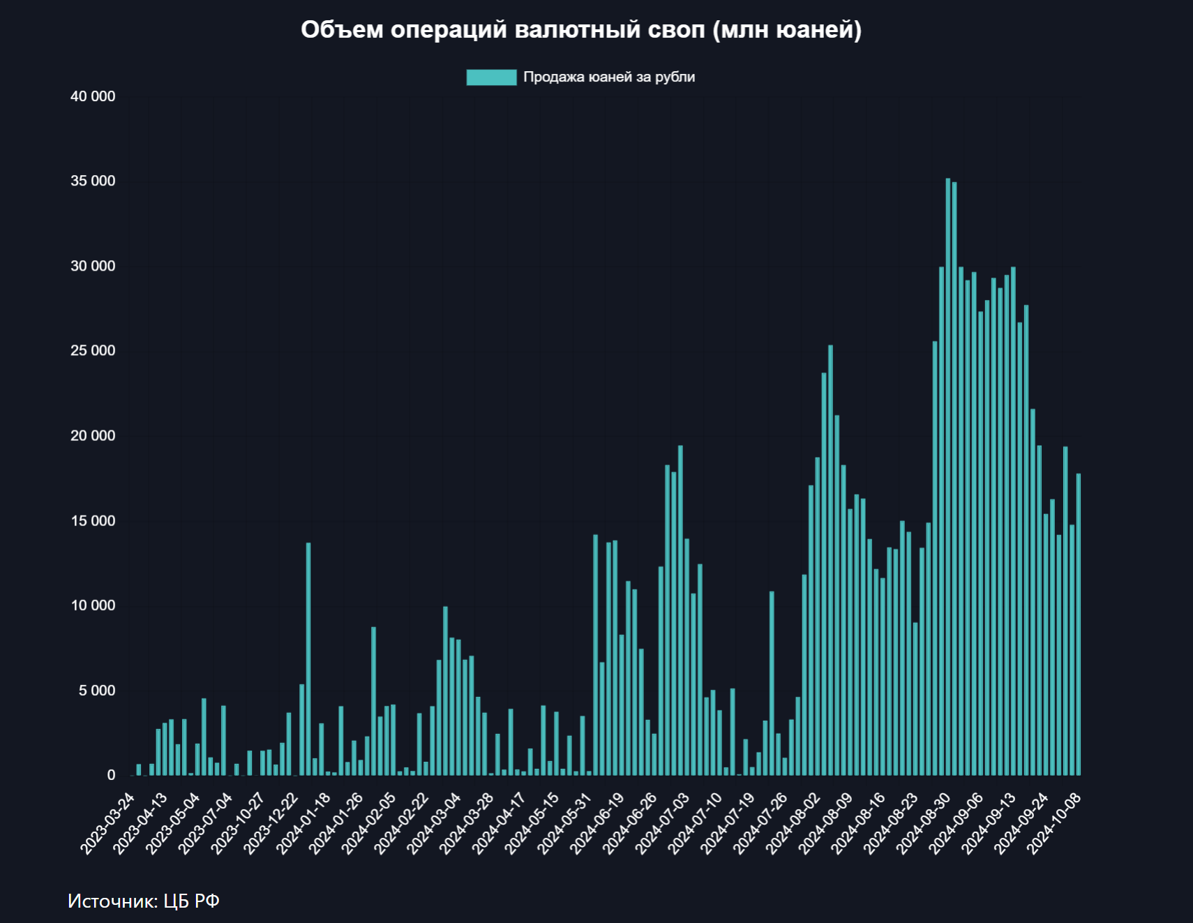 Спрос на юани остается повышенным, однако уже более умеренным, нежели в середине сентября. Центральный банк 08 октября возобновил операции "валютный своп" по продаже юаней за рубли. За день было совершено сделок на сумму в 17,8 млрд юаней, что больше, чем 30 сентября на 3 млрд.