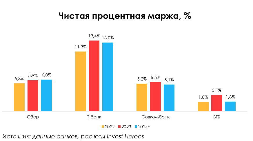 Мы считаем, что в 2024 году большинство банков покажут прирост по чистым процентным доходам по причине высокого уровня потребления в экономике и деловой активности предприятий (активно брались кредиты). При этом на фоне роста ключевой ставки и соревнований банков по привлечению депозитных клиентов (высокими ставками) чистая процентная маржа умеренно снизится. Мы ожидаем, что чистая процентная маржа Т-банка составит 13,0% (-0.3 п.п. г/г), у Совкомбанка — 5,1% (-0.4 п.п. г/г), у ВТБ (как наиболее восприимчивого игрока к стоимости фондирования) маржа снизится до 1,8% (-1.3 п.п. г/г), а Сбер может показать небольшой рост до 5,98% (+0.08 п.п. г/г).