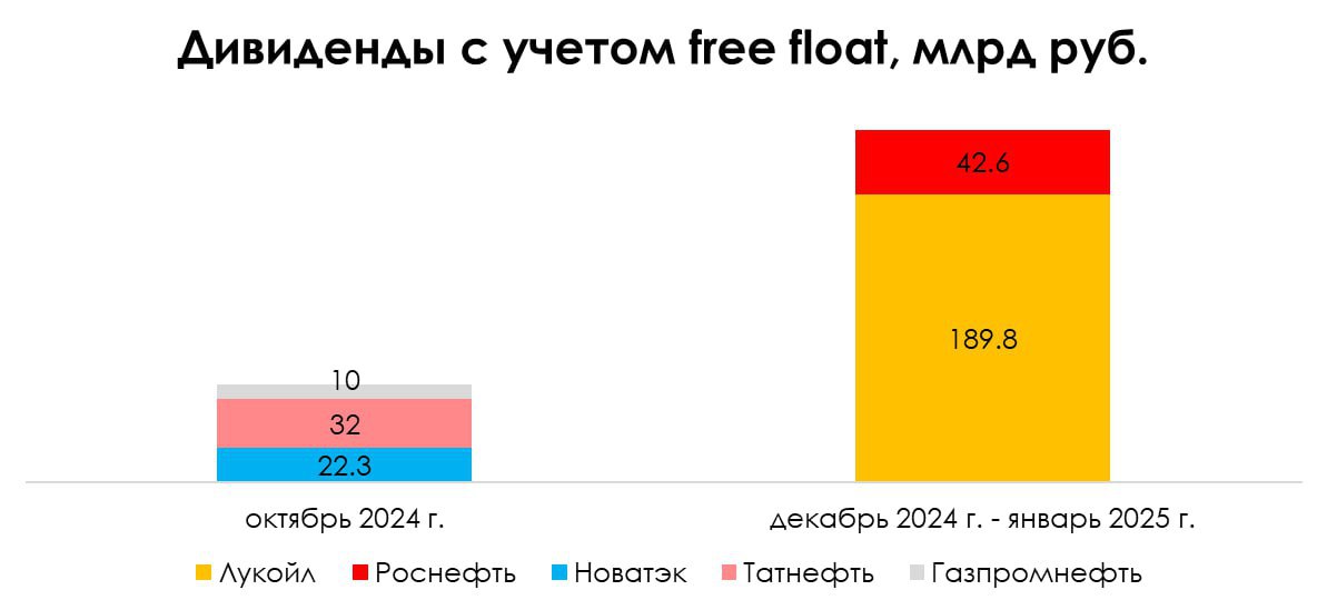 До конца октября на рынок должны прийти дивиденды по итогам 1П 2024 г. от «Татнефти», «Газпромнефти», «Новатэка» в сумме около 64 млрд руб. (с учетом free float). Основной приток ликвидности от дивидендов на рынок акций будет ориентировочно в январе, когда придут промежуточные дивиденды «Лукойла» и «Роснефти» в размере 232-278 млрд руб. (с учетом free float).