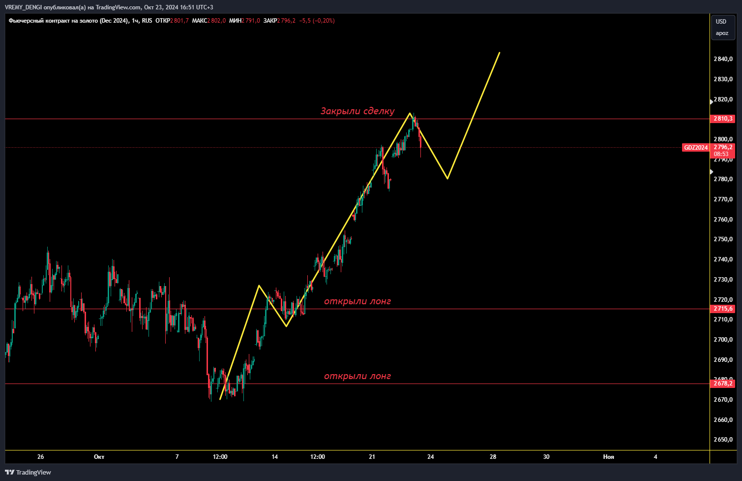 Для начала стоит отметить, что отторговали мы золото на ура и закрыли лонг на самом пике, как показано на графике ниже.