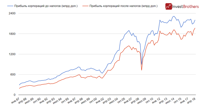 В то же самое время данные результаты немного обманчивы. Они таковы из-за налоговой реформы, которая была проведена в конце 2017 г. Благодаря снижению фискальных платежей компаниям удалось получить рекордную прибыль. Поэтому более информативным будет объем доходов до уплаты налогов. Здесь американским организациям не удалось установить рекорд — во втором квартале 2018 г. они заработали 2,2 трлн долларов, тем самым устоял предыдущий максимум в 2,32 трлн долларов.