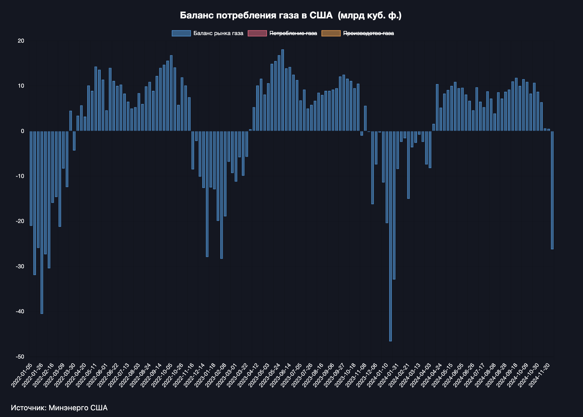 Совокупное потребление в последнюю неделю ноября оказалось рекордной за несколько лет для данного периода. Метеорологи уже предупреждают, что нынешняя зима может оказаться куда более суровой нежели предыдущие. Это может спровоцировать более высокий спрос на газ, что приведет к сокращению запасов до средних уровней. Пока запасы газа выше средних, что оказывает дополнительное давление на котировки.