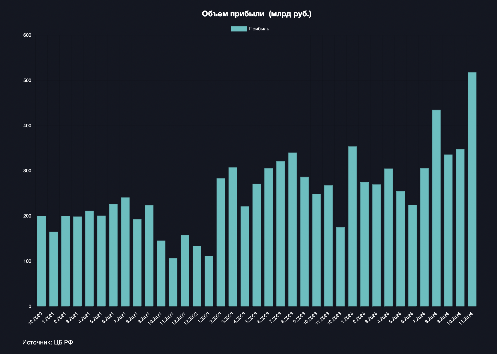 Согласно данным Банка России, в ноябре банковские сектор страны получил рекордную за всю историю чистую прибыль размером в 518 млрд рублей. До этого предыдущий максимум был установлен в августе 2024 г. с объемом прибыли в 418 млрд рублей.