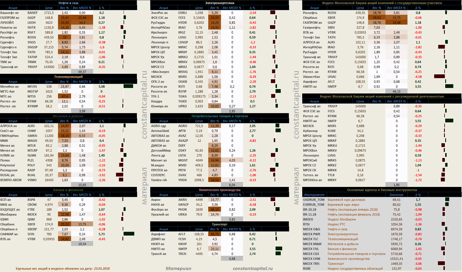 Динамика акций за текущий день, в структуре отраслевых индексов, и индексов государственного сектора.