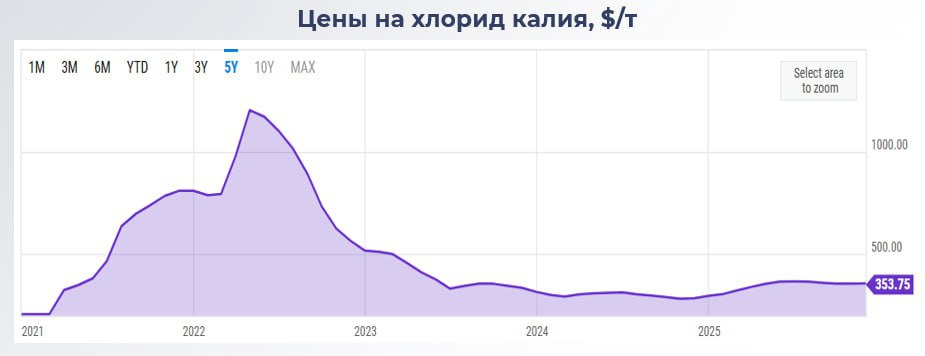«Фосагро» в основном реализует фосфорсодержащие и азотные удобрения. По итогам 9 мес. 2025 г. совокупно на эти виды удобрений приходится около 98% продаж (77% на фосфорсодержащие и 21% на азотные удобрения), поэтому цены на калий не влияют на выручку компании.