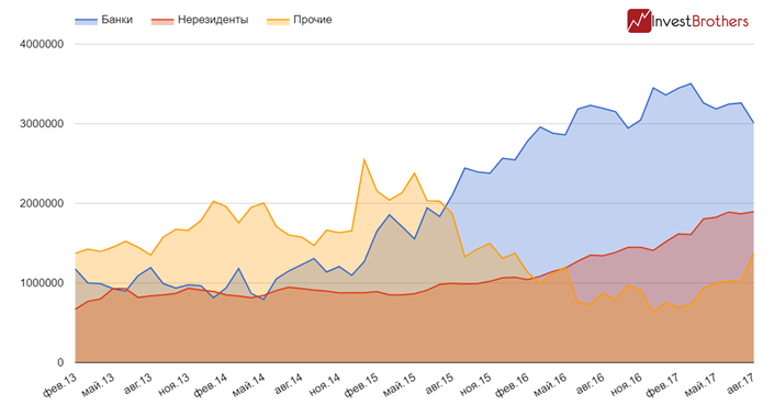 Сам рынок ОФЗ в течение июля увеличился на 132 млрд рублей. Практически все бумаги были приобретены прочими участниками рынка. Нерезиденты купили облигаций лишь на 27 млрд рублей.