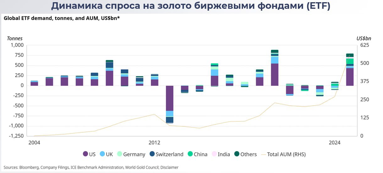 - Инвестиционные биржевые фонды (ETF) стали самым быстрорастущим сегментом, обеспечив 0,8 тыс. тонн дополнительного спроса (в 2024 г. спрос со стороны ETF был околонулевой).