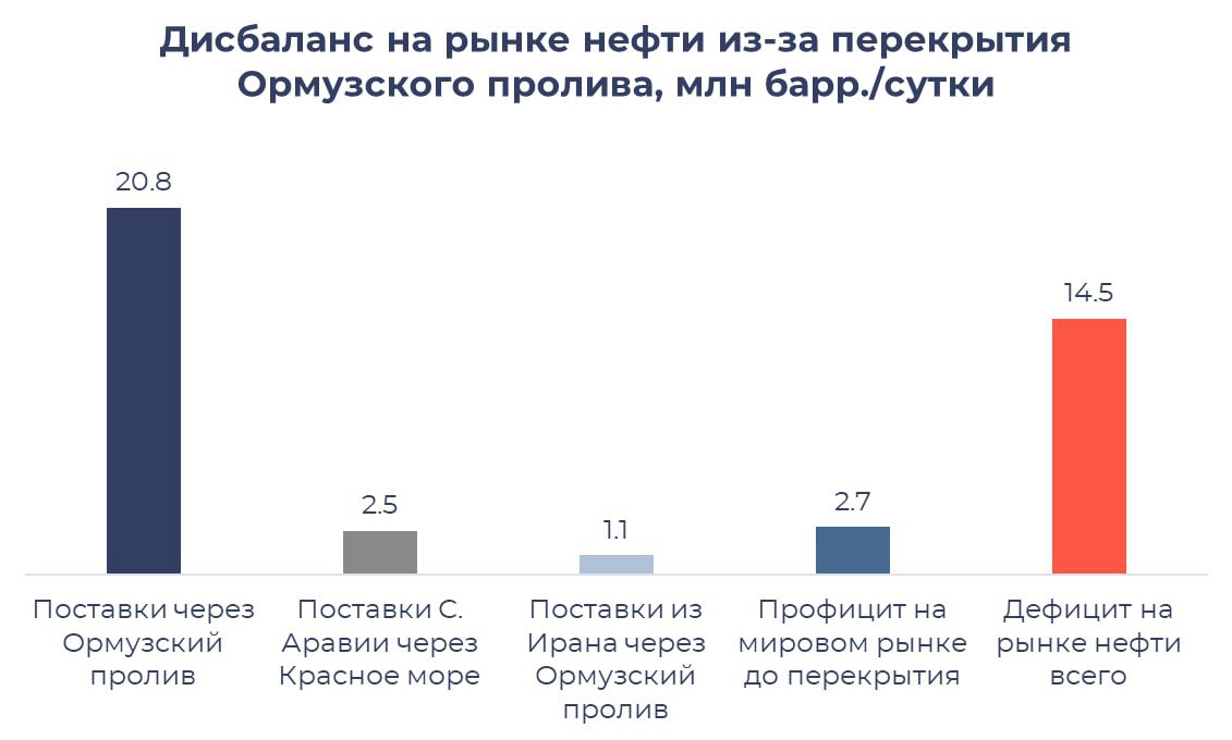 До блокировки Ормузского пролива в феврале 2026 г. профицит на рынке нефти в мире составлял 2,7 мбс. За период с 2024 г. по февраль 2026 г. в мире накопился профицит всего на 1,2 млрд барр. (примерно на 2 мес. поставок нефти и нефтепродуктов из Ормузского пролива). Из-за закрытия пролива дефицит нефти (и нефтепродуктов) в мире в данный момент составляет около 14,5 мбс (с учетом того, что без закрытия профицит был бы на уровне 2,7 мбс).