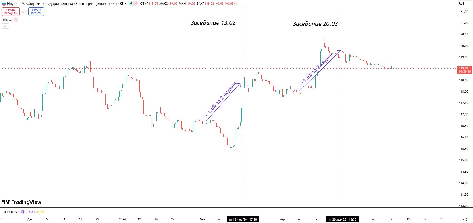Однако перед февральским и мартовским заседаниями индекс RGBI в среднем рос на 1,6% за 2 недели до заседания. Вероятно, ситуация может повториться и в апреле. На этой неделе будем наблюдать и анализировать статистику по инфляции за март.