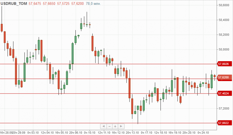 Рубль/$ во вторник так и не дал четкого сигнала по направлению движения, проведя торги в коридоре 57,40-57,60, слегка прокалывая границу верхнего диапазона, при закрепление над которым следующие цели роста расположены на отметках 57,80 и 58 рублей за доллар.