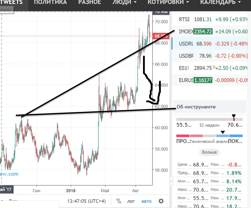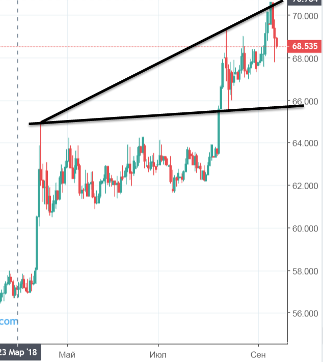 То, что рубль оттолкнулся от верхней границы вульфа уменьшает вероятность отработки паттерна. Поэтому на этот момент шортить сишку, лучше при уходе ниже 68. При этом уходе рубль может развивать движение вплоть до уровня в районе 62.