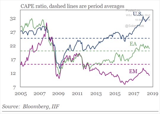 Расхождение в Cape ratio между США и остальным миром расширяется.