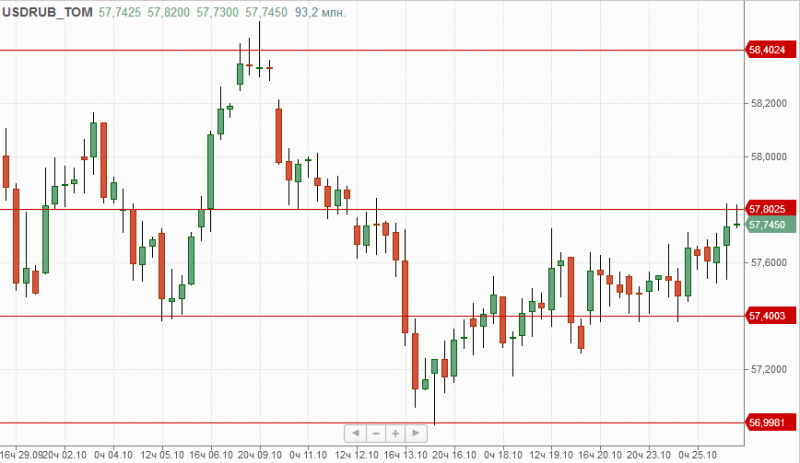 Пара рубль/$ медленно, но верно продолжает подрастать, закрепившись над отметкой 57,60, которая в текущей ситуации служит локальной поддержкой (основная 57,40). Цели роста расположены на отметках 58 и 58,40.