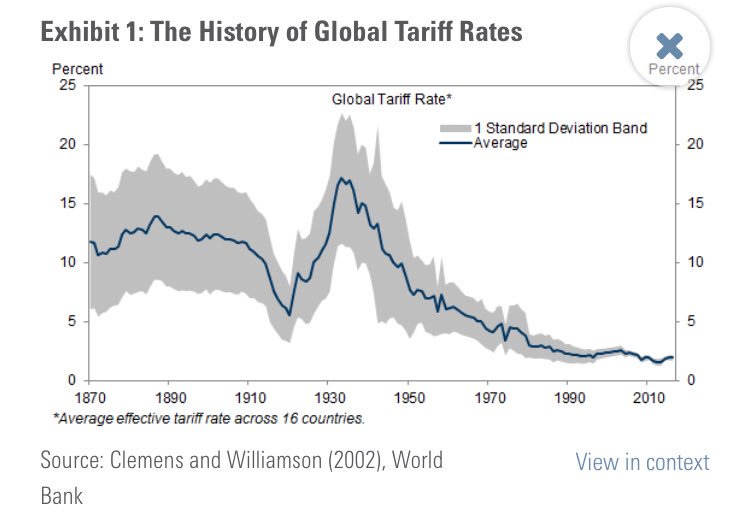 Здесь мы видим, что за послевоенную историю тарифы постоянно снижались. Но есть ещё один интересный момент на ней. Это рост тарифов перед великой депрессией. Который начался после первой мировой войны. Тогда рост тарифов между прочим сопровождался быстрым ростом американского рынка.