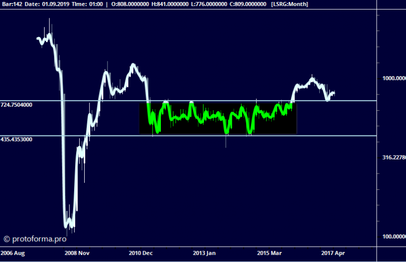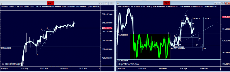 Акции ГК "ПИК" и ПАО "Группа ЛРС" торгуются на ММВБ (месячные графики):