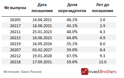 Больше всего иностранным инвесторам «полюбились» ОФЗ 26212, там концентрация составляет 67,5%. В выпуске 26215 их доля равна 64,8%. Также нерезидентам «по душе» бумаги 26207 и 26218 с долей в 59% и 59,6% соответственно. Средний срок погашения данных бумаг составляет 8,7 лет. То есть, нерезиденты предпочитают покупать средне- и долгосрочные ОФЗ.