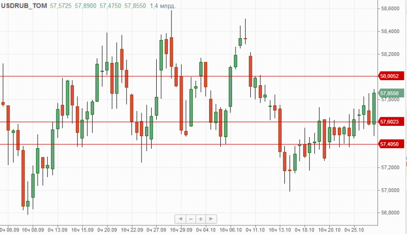 Рубль несмотря на галопирующие нефтяные котировки продолжил свое движение в сторону отметки 58 в ожидании решения по ставке ЦБ РФ. Поддержкой на данном этапе выступает отметка 57,6 и основная 57,4