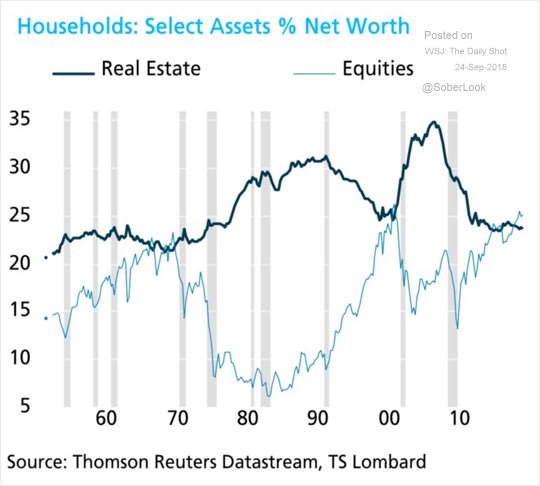 При этом количество акций на руках у населения находится на максимальном уровне если смотреть в процентах от стоимости домохозяйств. Люди переходят из недвижимости в акции: