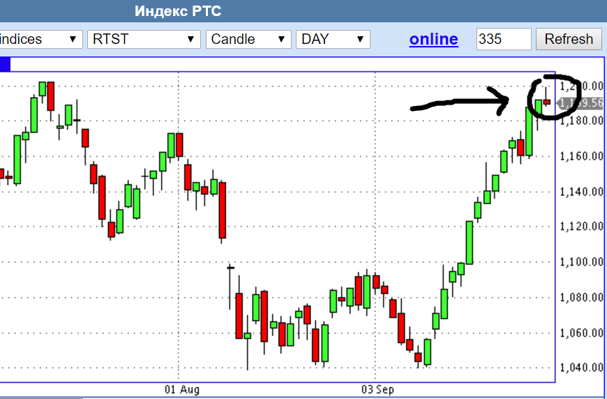 Эта вторая картинка показывает ситуацию на текущий момент. В Индексе формируется разворотная свеча на днях прямо от главного уровня сопротивления. Если день так и закроется то рынок сможет откатить вниз как минимум до 1160.