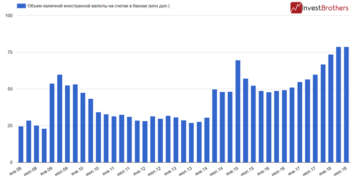По подсчетам Банка России, к началу третьего квартала 2018 г. на счетах в банках находилось 78,79 млрд долларов, что примерно на 20 млн больше, чем в марте текущего года. Таким образом, был установлен новый абсолютный рекорд по сумме наличных средств.