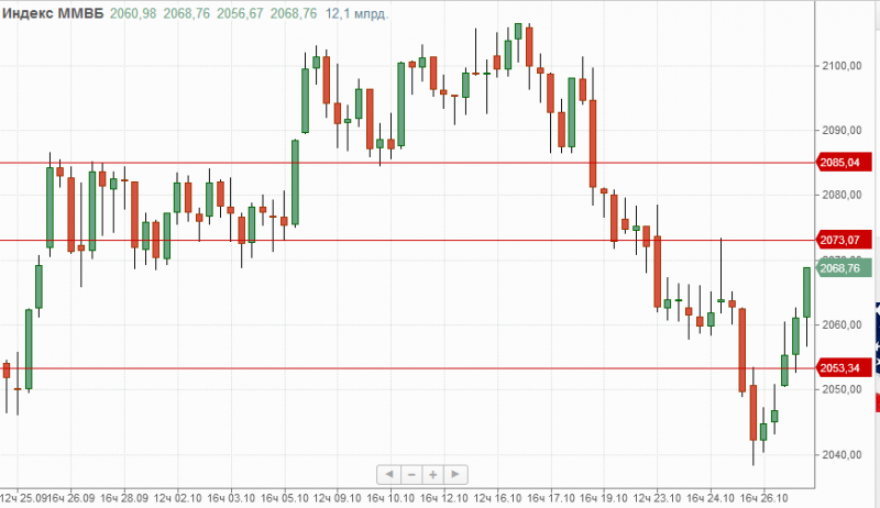 Индекс ММВБ на прошедшей торговой сессии закрылся на мажорной ноте, прибавив порядка 1% и для продолжения роста в район 2085п. индикатору нужно закрепиться над 2073п. Поддержкой на данный момент служит отметка 2053п., проход которой снова может вернуть продажи.