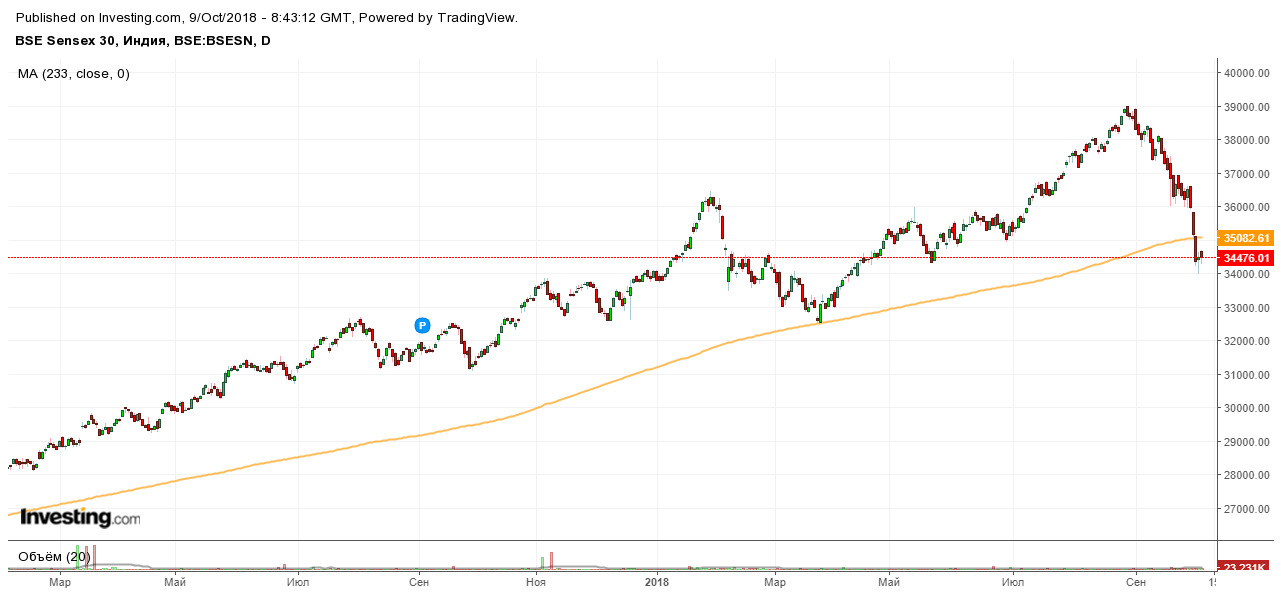 Индийский фондовый индекс BSE Sensex 30 растерял весь свой рост за 2018 год и похоже начинает выпадать из растущего тренда. А вот рост доходности по гос. облигациям Индии, 10 летки 8,05%, 2 летки 7,84% пока остановился. Похоже в экономику еще начинает вмешиваться еще и политика, я имею ввиду поставки российских С-400 индийской армии. Естественно США не довольны этим фактом и грозят санкциями Индии. @pro_dengu