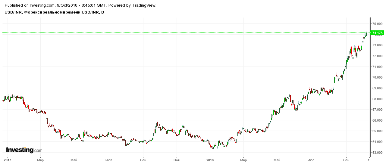 Индия. Пока напряженность на развивающихся рынках временно ушла, в Индии ситуация ухудшается. Индийская рупия с завидной постоянностью устанавливает новые минимумы, в моменте сейчас выше 74 рупии за доллар. С начала года рупия потеряла около 17%. Рупия как пробила уровень 69, так не может остановиться в своей девальвации. ЦБ Индии на днях оставил ключевую ставку без изменения 6,5%, ожидания были что поднимет на 0,25%. Ранее пост по теме на телеграм канале https://tele.click/pro_dengu/154