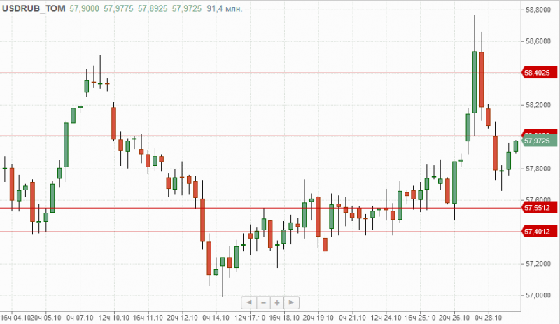На данном этапе рубль продолжает торговаться в рамках диапазона 57,40-58,40, где сопротивлением на пути роста к его верхней границе выступает отметка 58, локальная поддержка в текущей ситуации 57,55.