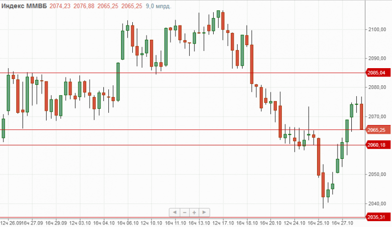 Индекс ММВБ на прошедшей торговой сессии закрылся на поддержке 2065п. Сопротивлением в текущей ситуации выступают отметки 2080п.-2085п., проход отметки 2060п. может снова усилить продажи.
