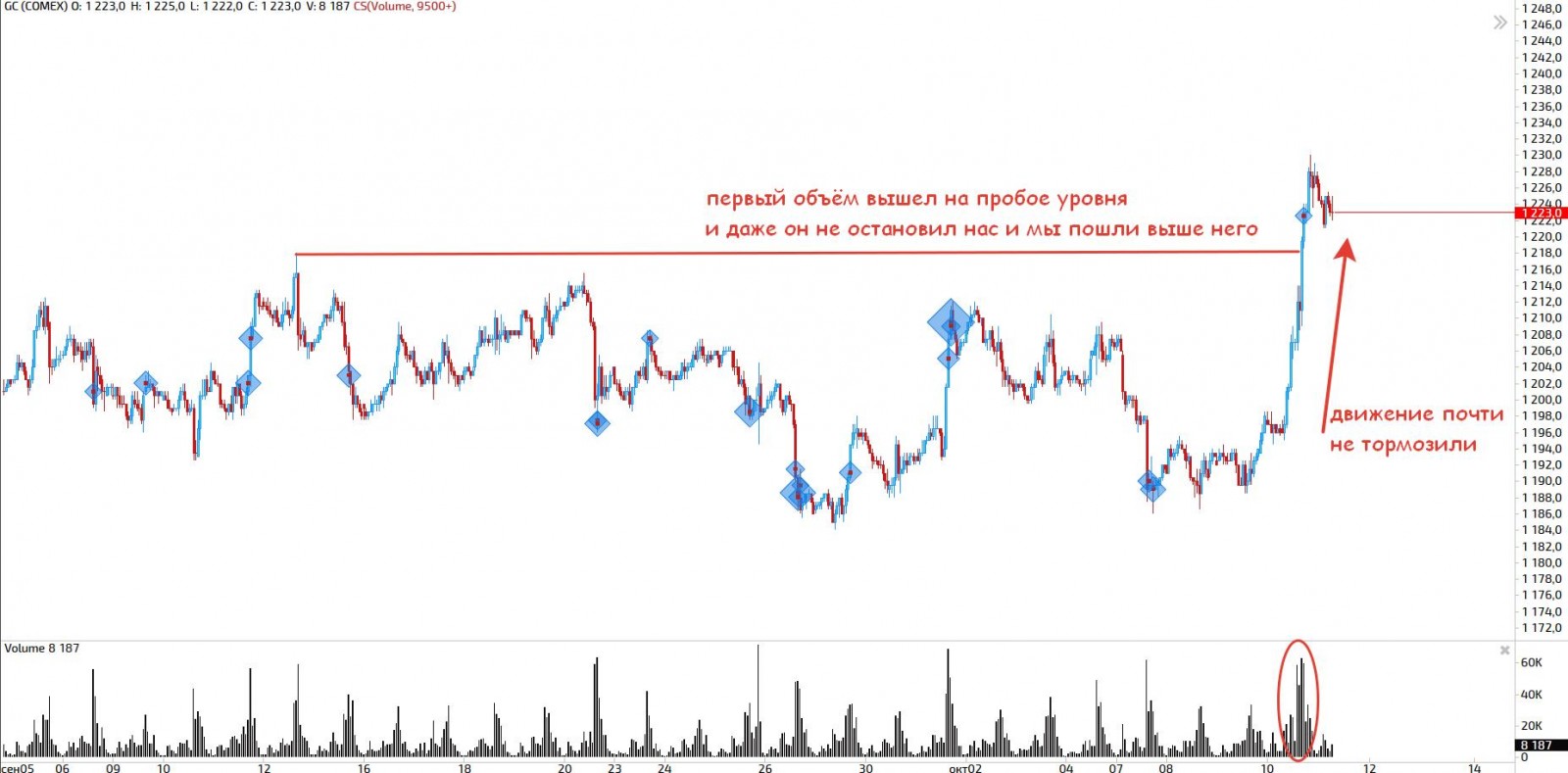 Пробой идёт очень благоприятно, никто не скидывает какие-то крупные объёмы против движения, проваливаемся как нож в масло.