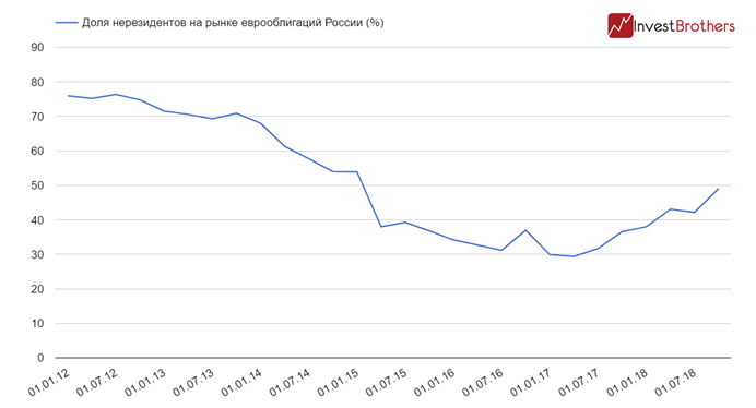 По итогам сентября доля нерезидентов на рынке суверенных еврооблигаций достигла 49,1%, чего не было с января 2015 г. Причем в июле произошло погашение бумаг на сумму в 3,6 млрд долларов, при этом объем вложений иностранных инвесторов остался неизменным, сообщили в Банке России.