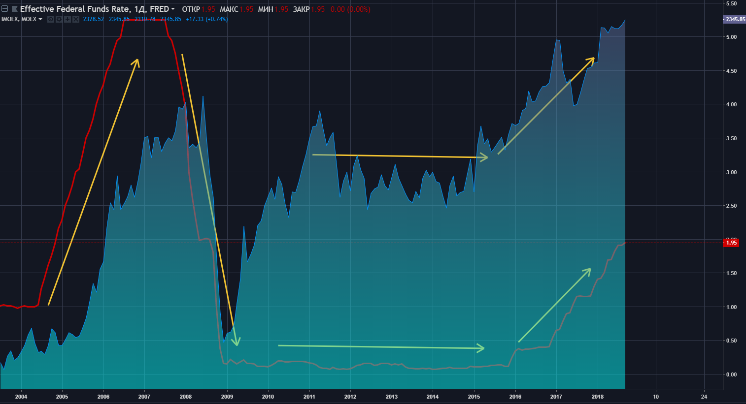 Далее ставкой начали манипулировать, пытаясь сгладить негативные процессы и подстегнуть экономику. Ну а после QE мир окончательно перевернулся. Последний раз рынок падал на растущей ставке! Ставка штурмовала 3.25, а фондовые площадки всех стран (и Россия не исключение) сильно падали.