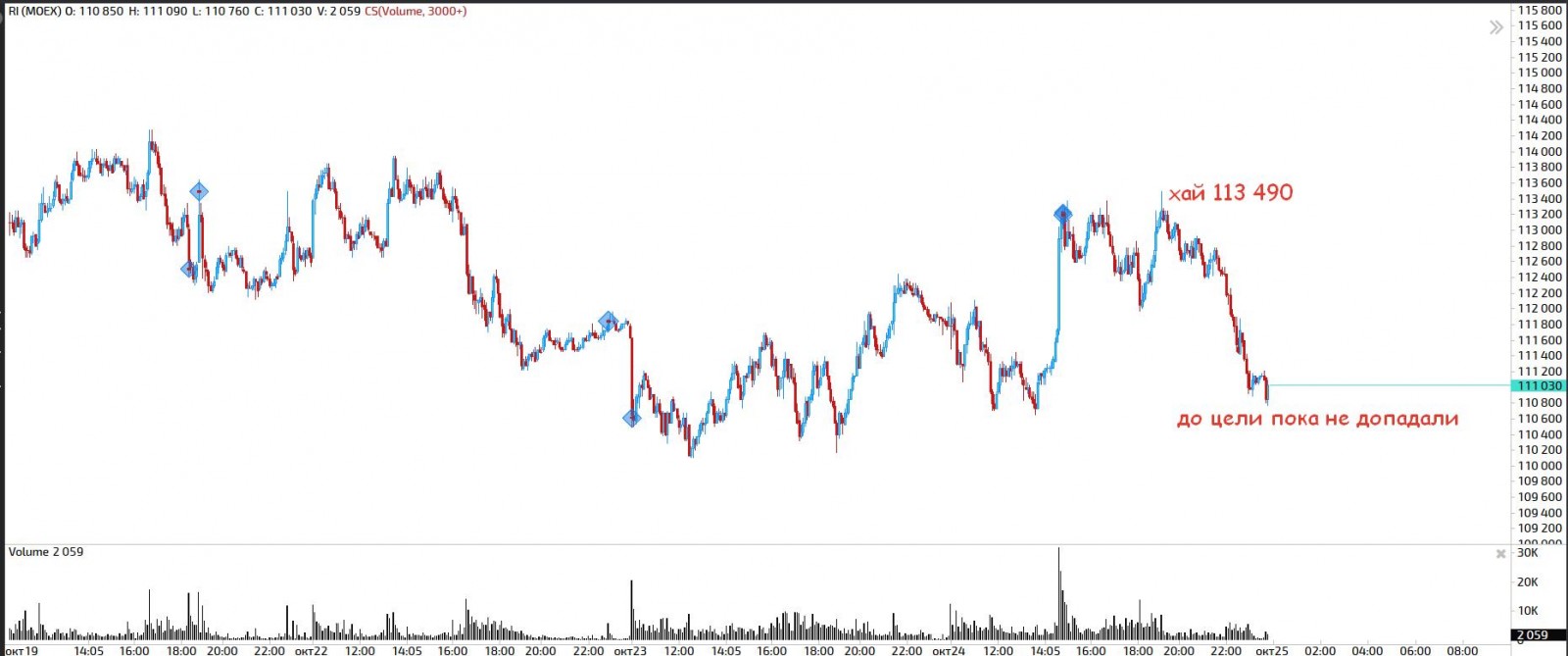 В итоге мы увидели отскок от уровня на РТС, чуть не дошли до первой цели около 110 000, но думаю утром после небольшого гэпа вверх это случитс