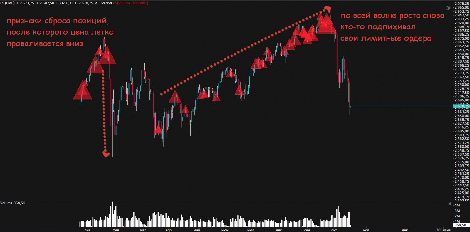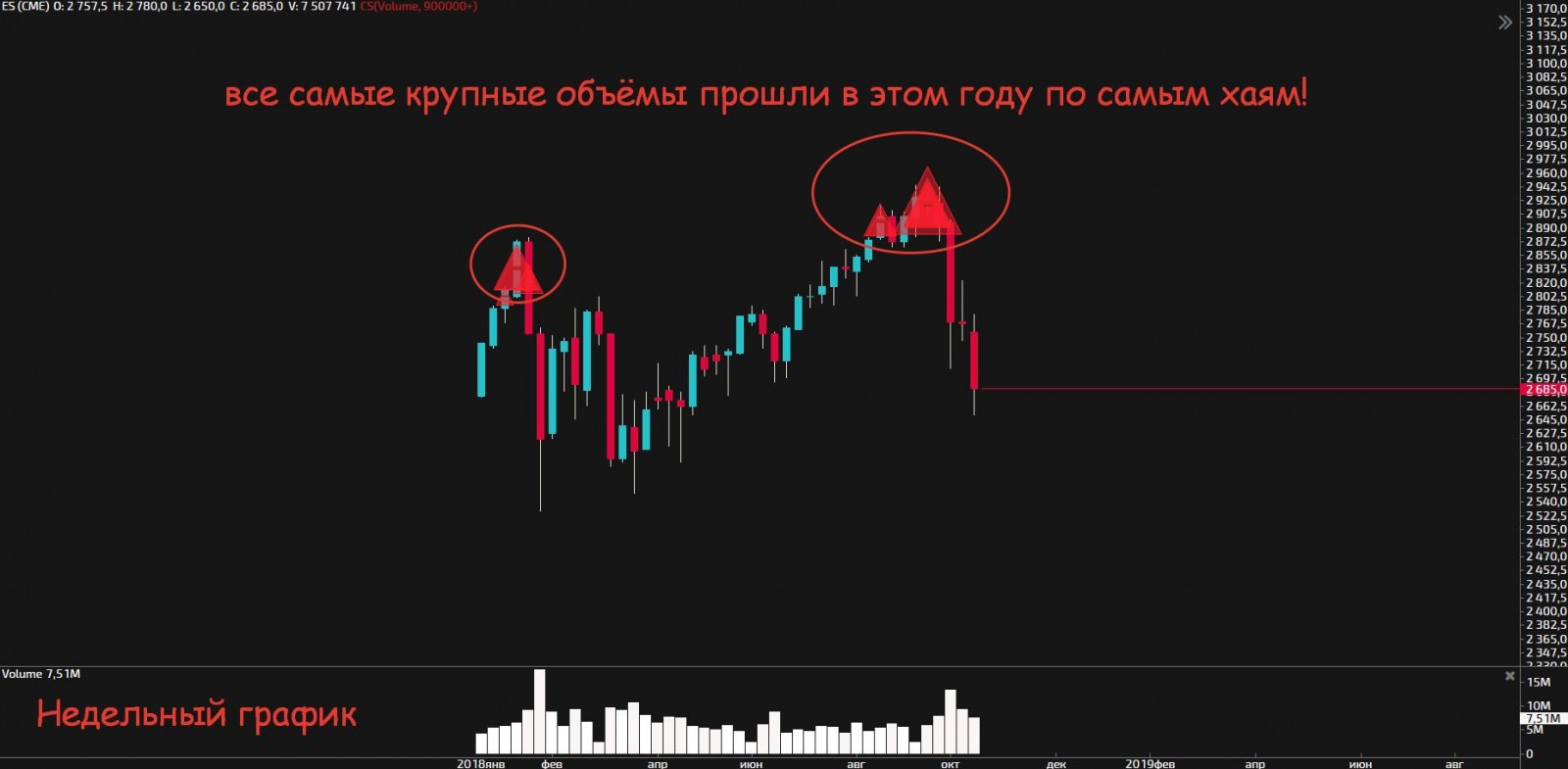 Всем привет народ! Я торгую по большей части наш рынок, поэтому подробно например америку не анализирую, а вот сейчас от скуки наблюдения за позицией решил заглянуть на объёмы старших ТФ на сиплом и у меня тревожные новости!