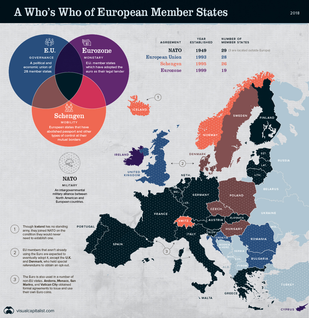 Европейские альянсы. На этой картинке вы увидите как пересекаются такие европейские структуры как ЕС, еврозона, шенгенская зона и НАТО: ес, еврозона, нато, шенген 28.10.18 19:46 10941 Ostap +10 Комментарии Нет комментариев. Ваш будет первым! Войдите или зарегистрируйтесь чтобы добавлять комментарии
