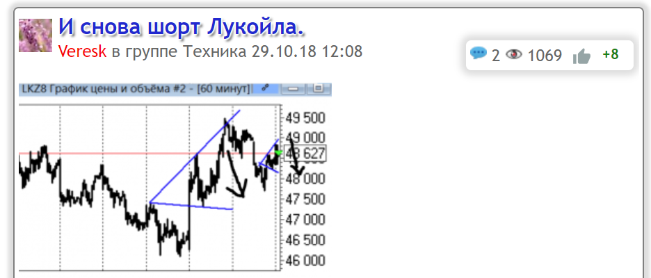 Шорт Лукойла закрыт. Профит 1%. Сегодня днём сбрасывал техничскую идею по Лукойлу: Мы можем пойти отрабатывать большого Вульфа, но малый уже отработан и 1% за день вполне достаточно. Так что закрываю эту сделку: лукойл, техника 29.10.18 22:27 8600 Veresk +25 3 комментария Krechetov 29.10.18 22:40 # ↓ хорошая сделка TimVV 29.10.18 23:02 (отредактировано) # ↓ +1 Спасибо автору. Очень хорошая сделка. tradbios 29.10.18 23:59 # ↓ Тоже сегодня шортил акции Лукойла с 4919, после пробоя 4875 закрывать сегодня сделку не стал. Я сделал ошибку?