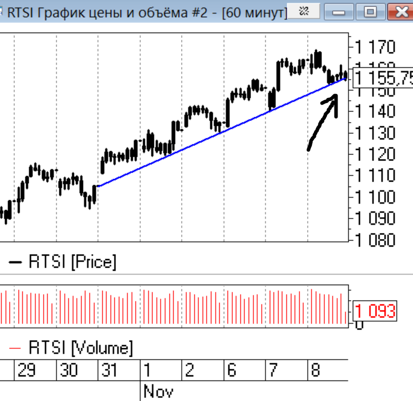 Чисто техническая идея. Имеем красивый тренд на часовиках РТС. Имеем явную слабость у этого тренда, отскочить у рынка не получилось. Следовательно пробой можно шортить сто стопами по тренду или на уровне 1160.