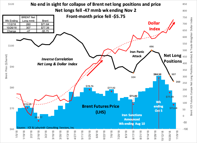 Нетто лонг по нефти находился на лоях года до -47 mmb. Нефть в последние недели падала на фоне роста индекса доллара, т.е. укрепления доллара в мире, что давит на все сырьевые активы: